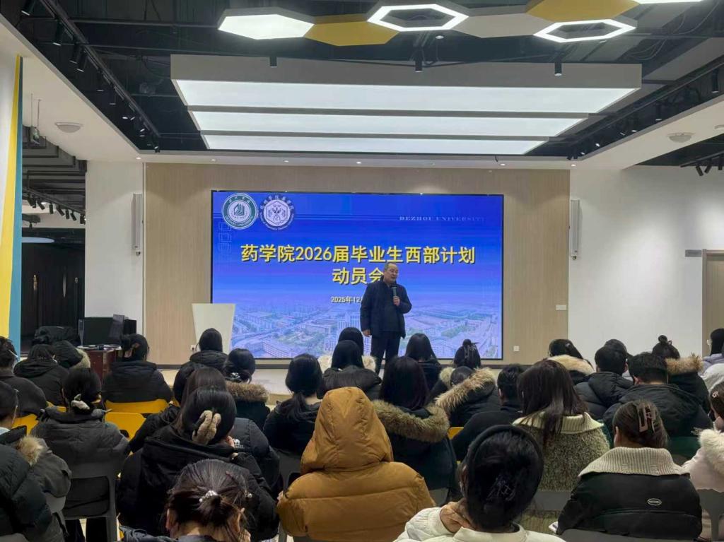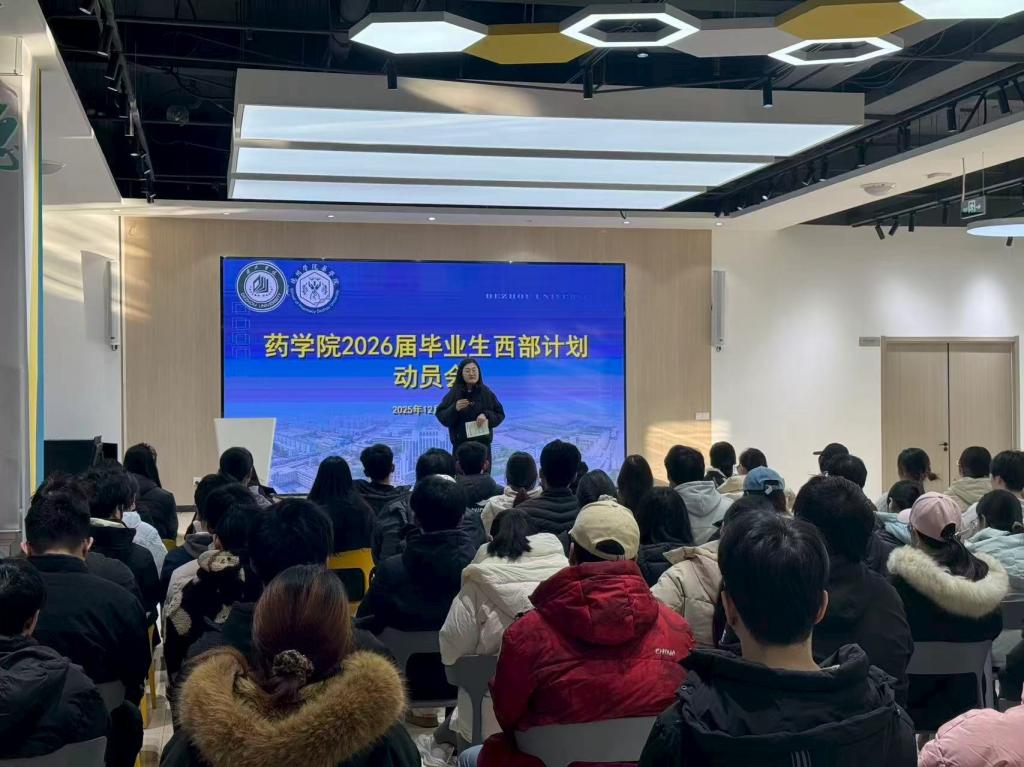 为动员2026届毕业生积极投身西部计划,将个人职业发展与国家基层建设需求相结合。药学院于12月29日下午在大学生就业创业赋能中心路演大厅召开了西部计划动员会。2026届全体毕业生参加。