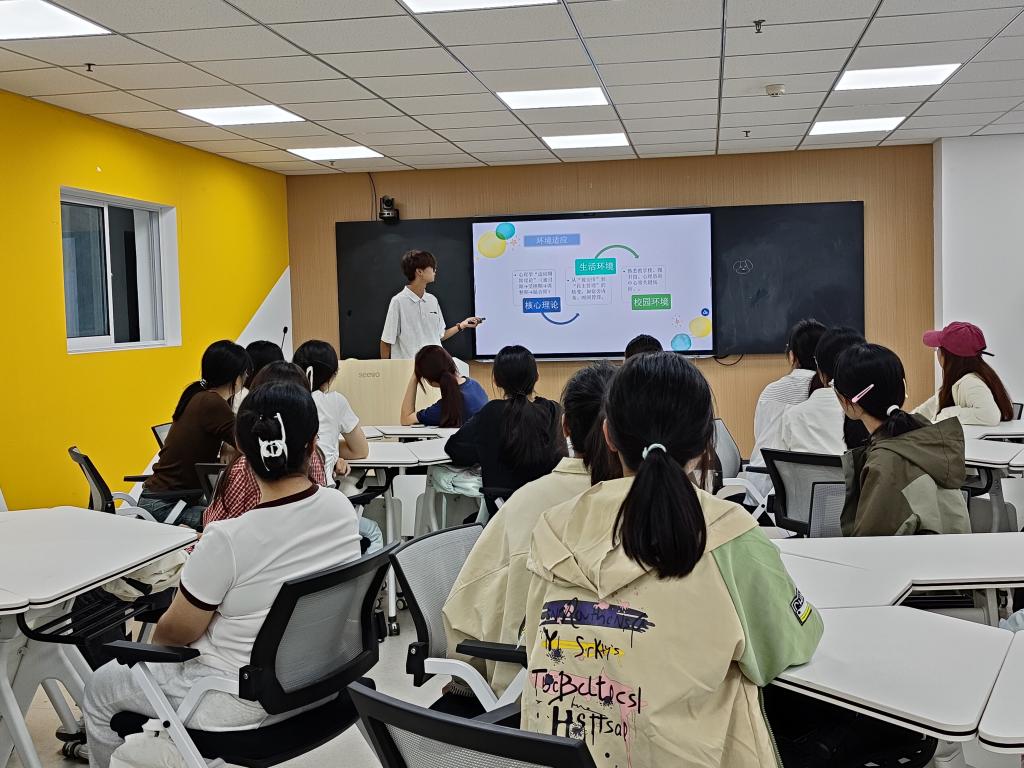 活动内容围绕三个维度有序展开。心理讲座部分聚焦环境适应、学业调适与人际交往,重点分享了室友相处“尊重差异、主动沟通、互帮互助”三大原则,以及如何与老师建立良好沟通。“气球漂流记”破冰游戏以趣味互动打破新生间的陌生感。最后,“绘出我的青春愿景”曼陀罗绘画让同学们借助纸盘、彩笔等材料,通过创作整合内心、表达自我、梳理情绪,并在绘画中融入对未来大学生活的期待与目标。