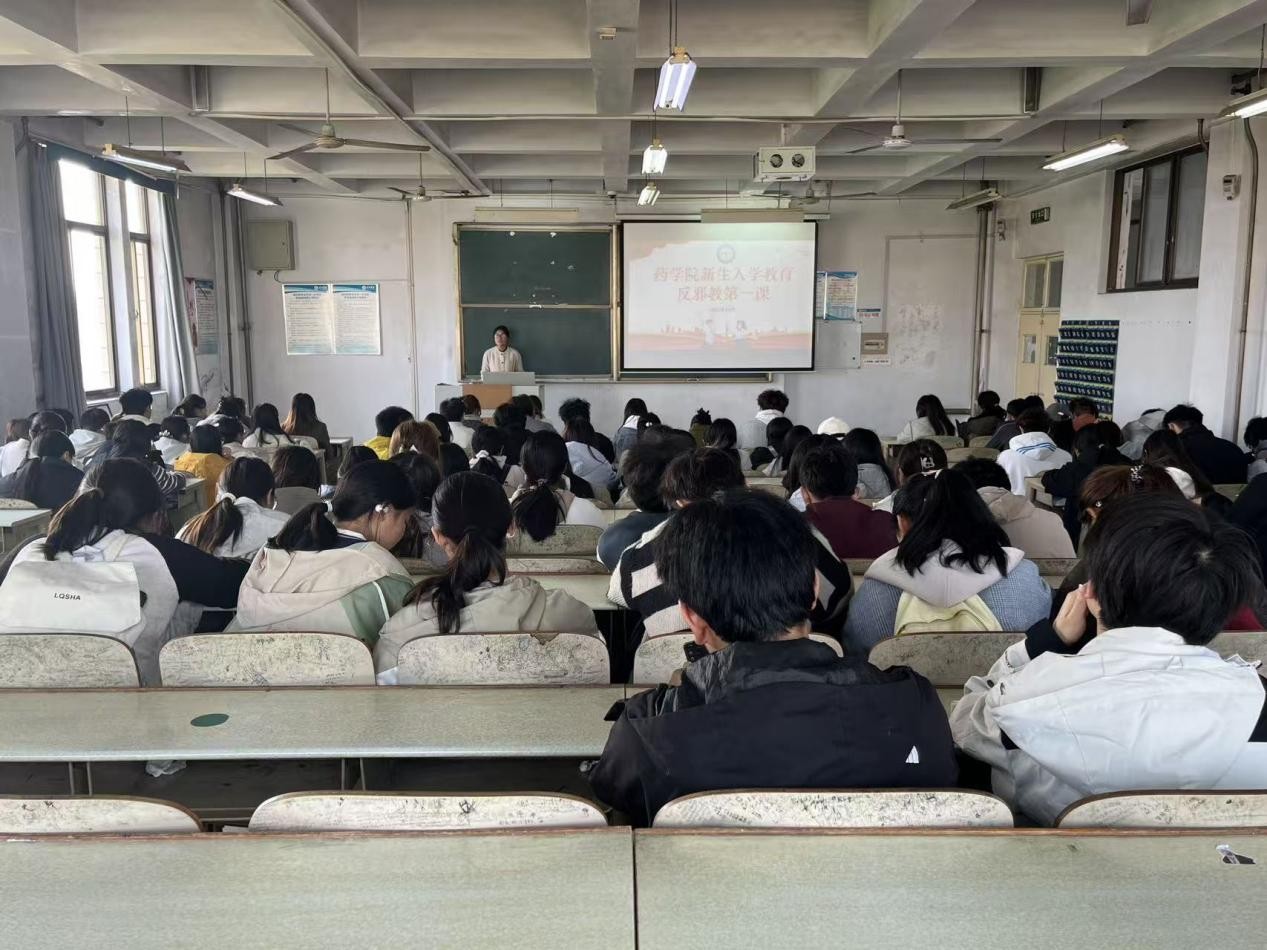 加强思想政治教育,筑牢思想防线。11月11日,药学院以新生入学教育为契机,于体育楼414教室开展“反邪教第一课”专题教育活动,全体2025级新生参加。