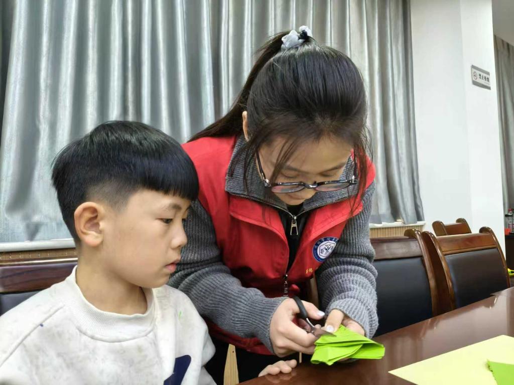 志愿者们精心搭建起“中药文化体验区”,通过实物展示、趣味图片与通俗讲解,带领大家认识黄芪、枸杞、陈皮等常见中药,详解其外形特征、实用价值及背后的文化典故。在手工环节,志愿者将艾草、薄荷叶等中药植物轮廓设计成童趣剪纸模板,耐心示范折纸、描线、剪刻技巧。孩子们专注投入,在指尖流转间剪出一幅幅创意十足的中药元素作品,不仅锻炼了动手能力,更在传统技艺实践中触摸到文化的温度。