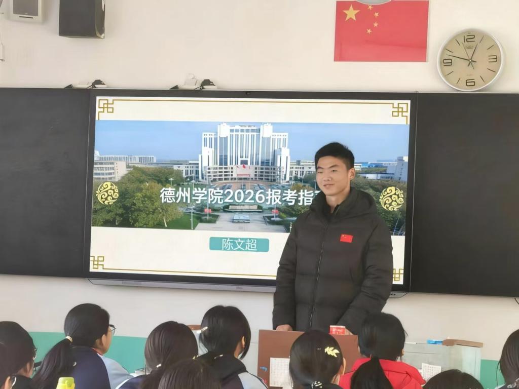 活动前期,陈文超主动对接母校老师,确定宣讲时间、地点及参与人数,同步从学校官网、招生办搜集各类资料,精心制作图文并茂的PPT,整理招生简章与专业解读手册,确保宣讲内容详实易懂。宣讲中,他向学弟学妹们全面介绍德州学院的办学历史、师资力量、药学院专业特色及丰富多彩的校园生活,并结合自身经历分享高考备考技巧与志愿填报经验。互动环节,他耐心解答“大学自主学习安排”“奖学金评定”等疑问,用真诚交流为学弟学妹答疑解惑。