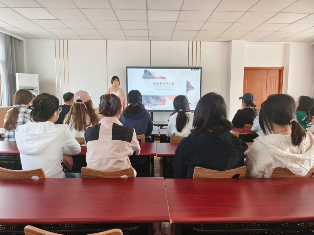 主讲人以陈皮的非遗传承背景为切入点,简要阐释活动意义,打破传统宣讲的刻板印象,营造轻松愉悦的氛围;通过PPT直观呈现,系统梳理陈皮的起源发展、道地特质与炮制技艺,结合《神农本草经》相关记载及现代药理研究,详解其理气健脾、燥湿化痰的核心功效,生动解读“一片橘皮藏本草,三年陈香润芳华”的深意;同时聚焦陈皮日常应用,科普其黄金搭配与烹饪技巧,让同学们掌握将中医药知识融入生活的实用方法。分享交流环节,同学们踊跃畅谈感悟,纷纷表示不仅学到了实用养生知识,更深刻体会到中医药文化的博大精深与时代价值。