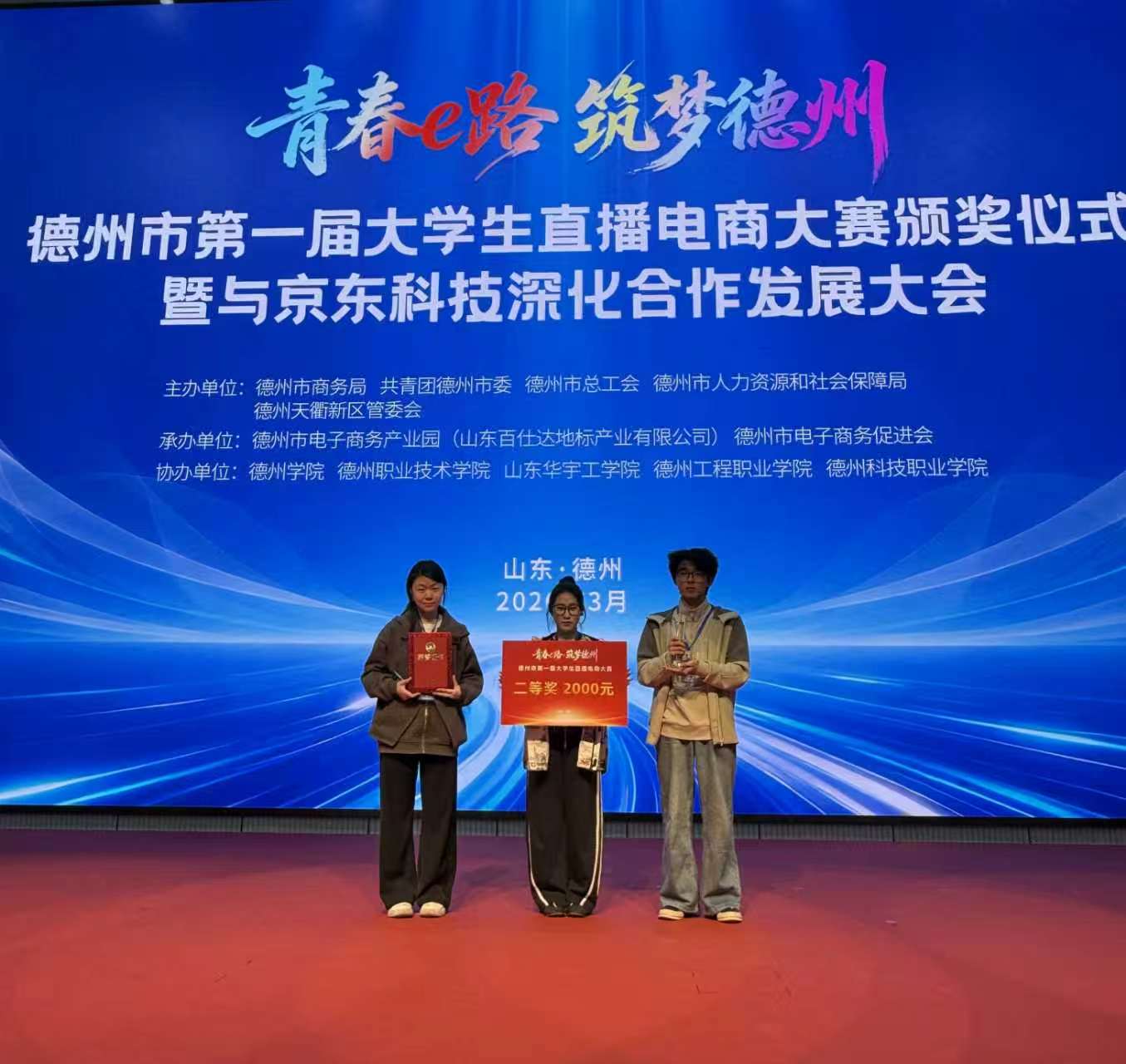 3月27日,德州市第一届大学生直播电商大赛决赛在天衢新区博览广场圆满落幕。本次大赛由德州市商务局、德州市总工会、德州市人力资源和社会保障局、共青团德州市人力资源和社会保障局、共青团德州市委联合主办,吸引全市多所高校参与。经初赛、复赛层层选拔、多轮比拼,最终52支队伍晋级决赛同台竞技。药学院积极组织学生参赛,凭借出色表现斩获二等奖,彰显了药学学子的专业素养与实践能力。